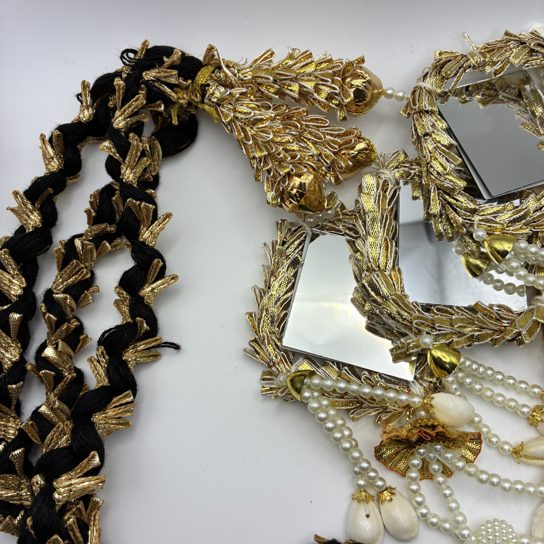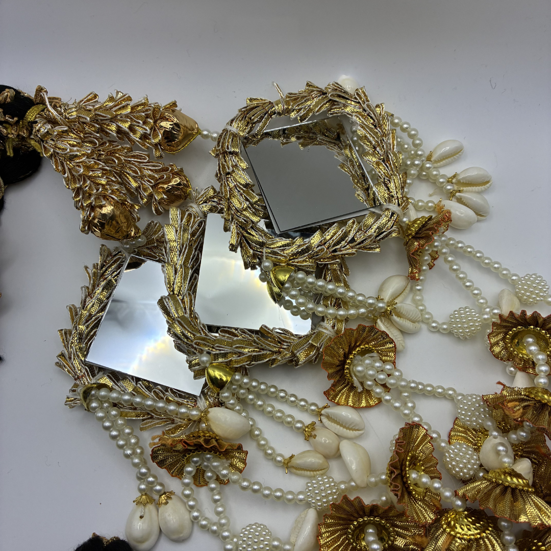 Gold Coloured Paranda with Square Shaped Mirrors and Kaudi Cowrie Shells and Pearls